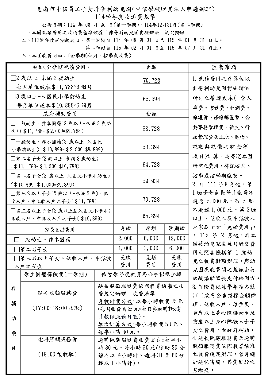 臺南市中信員工子女非營利幼兒園(中信學校財團法人申請辦理)位於中信金融管理學院美麗的大學校園裡,豐富的校園生物多樣性,綠意盎然環境優美。幼兒園以全人發展為目標,提供優質學習資源,給予幼兒最適切的學齡前教育。與永續大學校園設計理念結合,我們建構具有冒險性、挑戰性以及趣味性的園所設施,戶外活動是我們學習的核心,有樹屋、滑梯、沙坑、鞦韆、空中樹橋…等。我們以開闊的教學環境及開放主題加學習區的教育方式,打造主動式的學習園地,提供孩子們更多元及充滿趣味的學習活動,激發好奇心,讓孩子們能在這自然的環境裡盡情玩耍,不斷地嘗試探索、體驗與學習,發揮各種想像力及創造力,並從課程與遊戲活動中學習專注、培養溝通能力及團體生活能力。