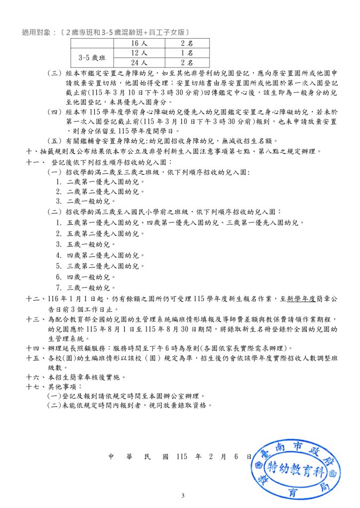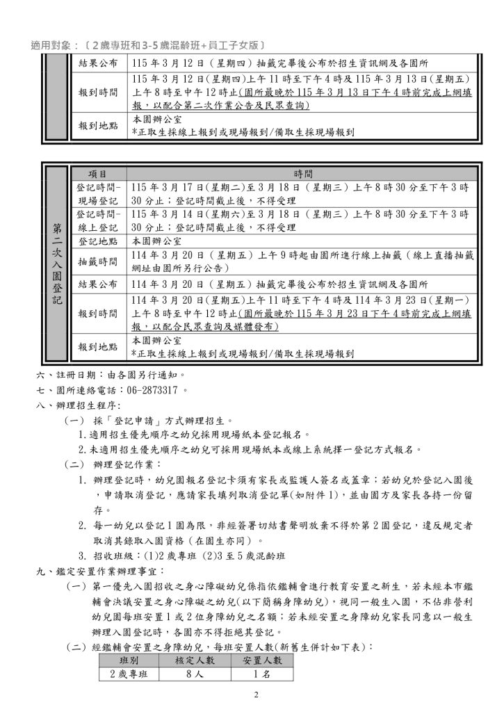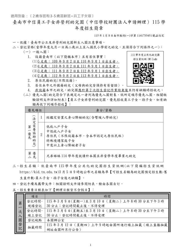 115學年度招生簡章 發佈日期: 2026 年 2 月 6 日2026 年 2 月 6 日 作者: vivienwang 115學年度招生簡章 誠摯邀請您加入我們溫馨、有愛的幼兒園 本園致力於打造安全、快樂且充滿學習樂趣的成長環境 ,在愛與關懷中陪伴孩子學習、探索與成長,培養良好的品格與多元能力,為未來打下穩固基礎 請於招生簡章公告期間內 掃描QR cord完成線上登記或 攜帶相關資料至本園辦公室報名即可參加「臺南市政府教育局統一抽籤」 歡迎家長踴躍報名,一起為孩子開啟美好的學習旅程 #幼幼班 #小中大班 歡迎來電洽詢:06-2873317-18